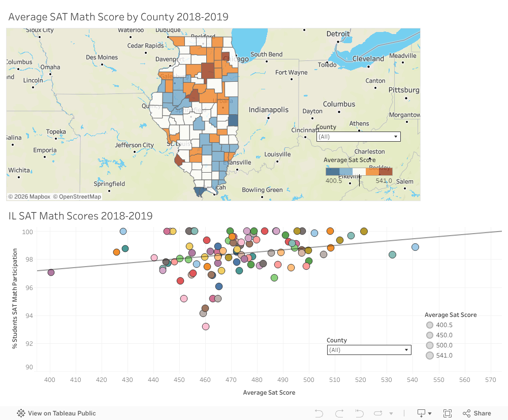 Method/Visualization Techniques The data used here to visualize the average SAT math scores across Illinois counties is from the Illinois State Board of Education Data Library archive from the 2018-2019 report card in the form of an excel spreadsheet. This data has not the average SAT scores for reading and mathematics, but the percentage of the total scores by race & ethnicity, IEP, income level, and ELA participation.